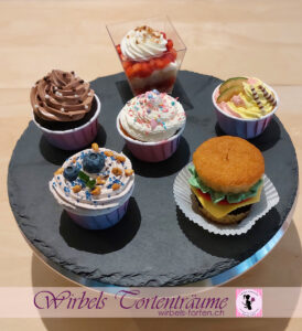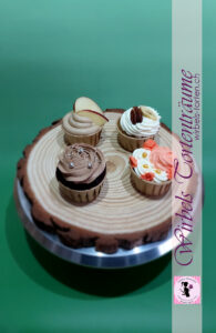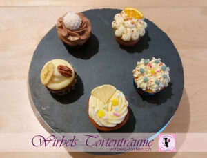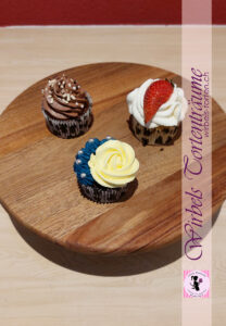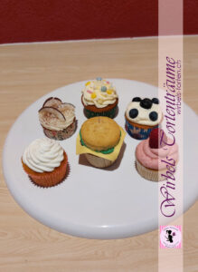 Meine Cupcakes werden mit einer Cremehaube versehen und mit Früchten, Zuckerperlen oder Fondant-Dekorationen, dem jeweiligen Anlass entsprechend dekoriert. Bei den Cremes handelt es sich entweder um Frischkäsecreme oder Buttercreme. Die Geschmacksrichtungen der Toppings variieren anhand des Geschmacks des Cupcakes.